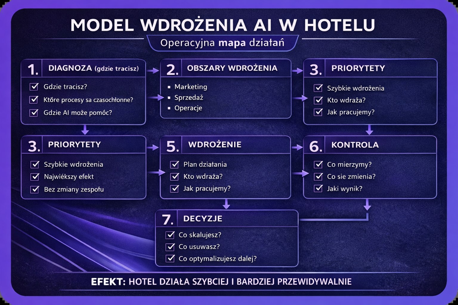Otrzymujesz jasny schemat wdrożenia AI dopasowany do realiów hotelu